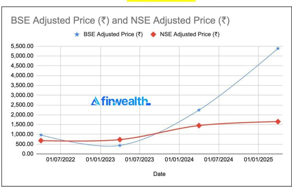 NSE’s ₹4.7 lakh crore valuation dwarfs BSE’s ₹85,334 Cr, yet its share price growth (142.65%) lags BSE’s (457.01%). This gap suggests revaluation potential